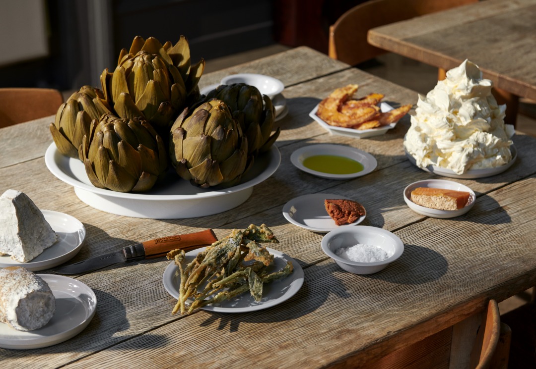 中央部にはあえて装飾を施さず、真っ白な磁器の余白を残すことで、盛り付けられる料理そのものを引き立てる構成となっています。さらに、日常使いのシリーズに加えて、大きなプレートの中央にシャルパンのドローイング“アラベスク”をあしらったエディションシリーズも展開され、器の中にグラフィック的な表現を取り入れています。