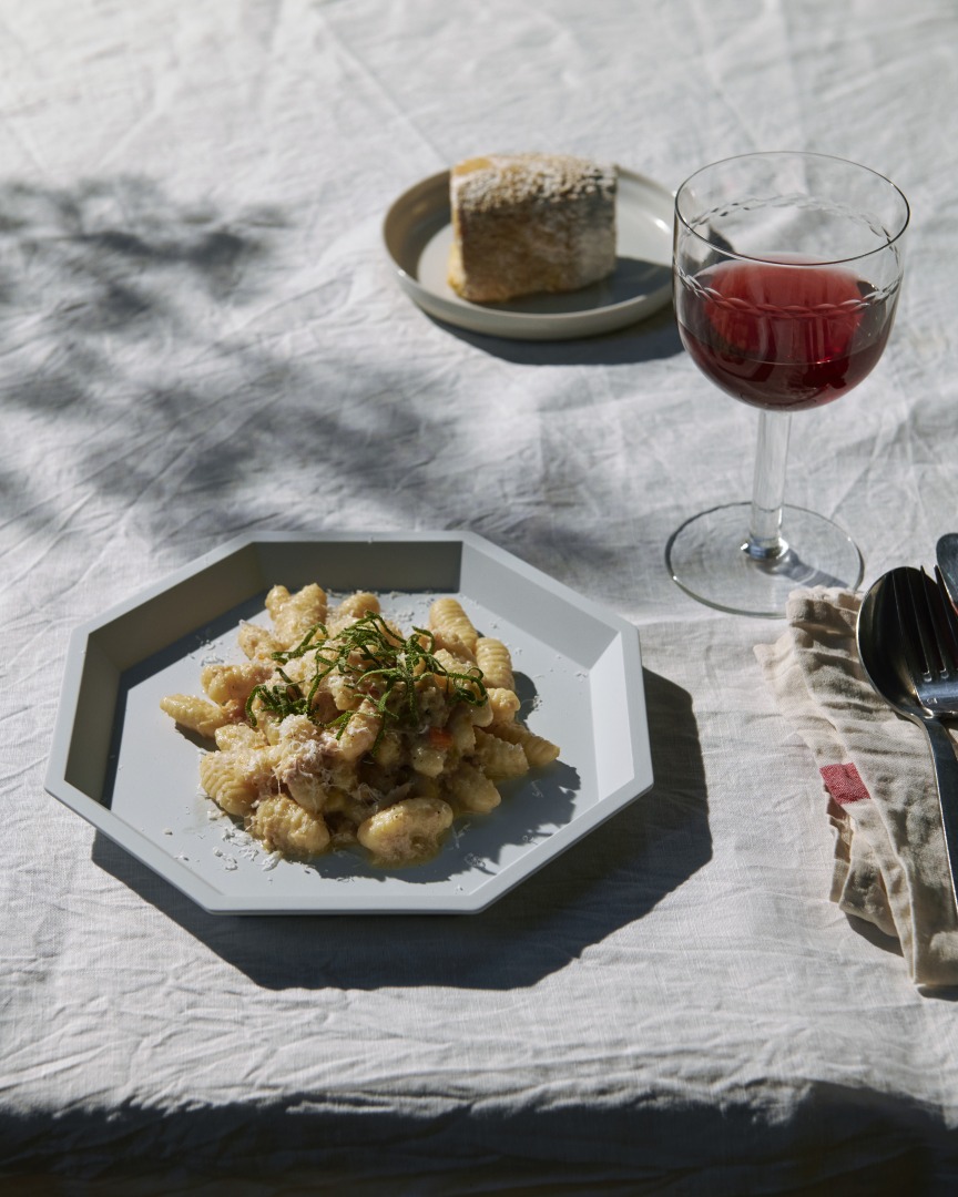 プレートやボウルはスタッキングできる構造をもち、「フラット」「ディープ」「ロー」「トール」という4つの要素を組み合わせることで構成されています。シンプルでありながらも用途の広いフォルムは、日常のさまざまなシーンに柔軟に対応します。