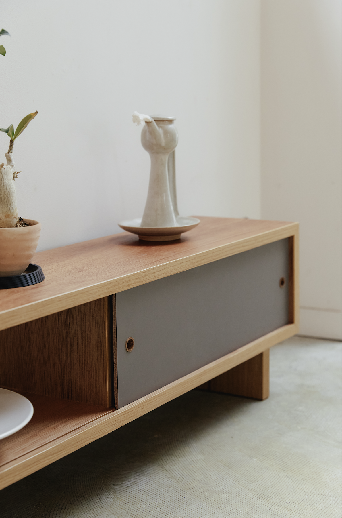 建具に開いた丸穴の引き手をアクセントに、シンプルなラインで構成されたデザインです。建具は左右どちらにも寄せることができ、建具のある面・ない面のどちらも正面として使える仕様。背中を見せず、オープンな棚としてもお使いいただけます。