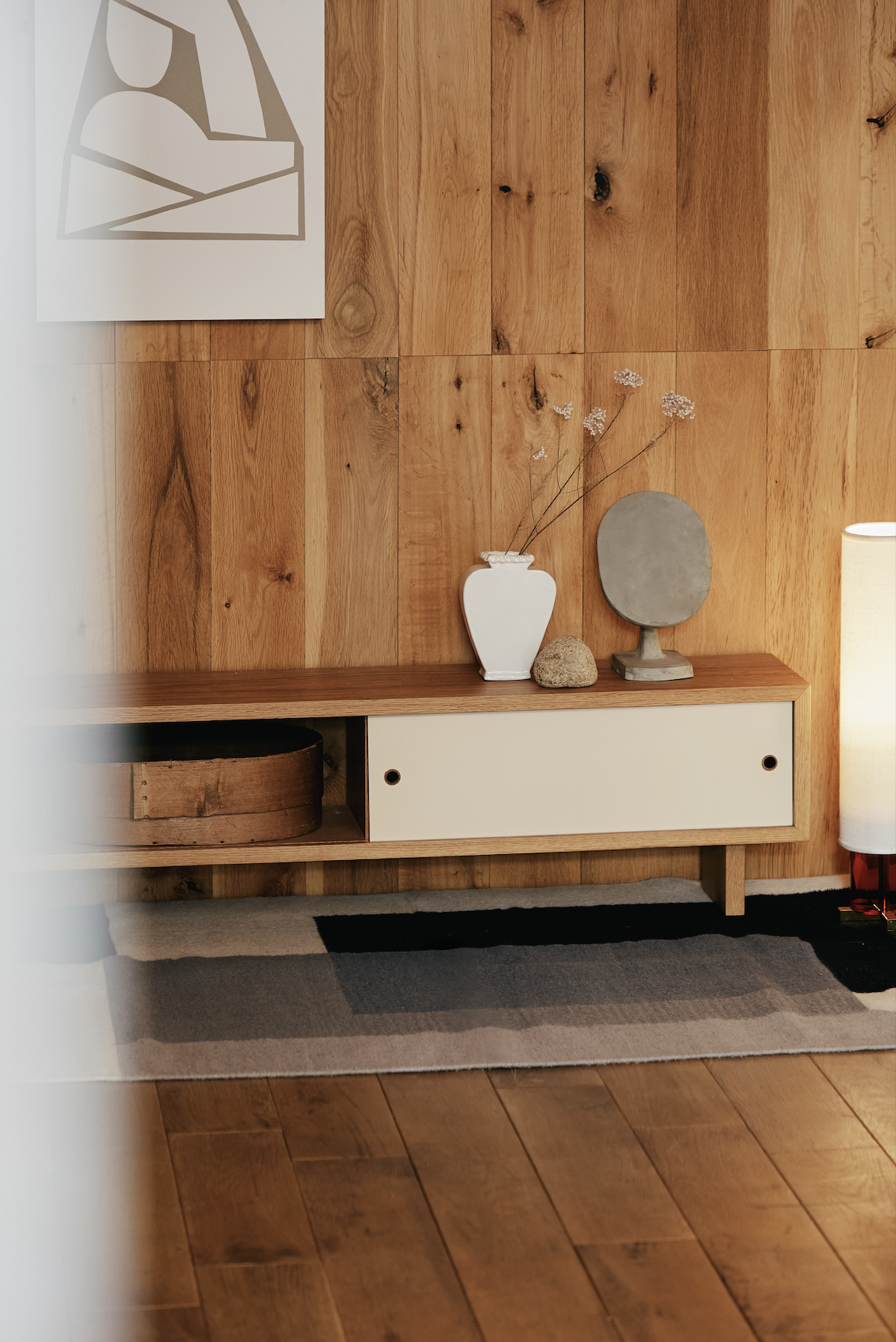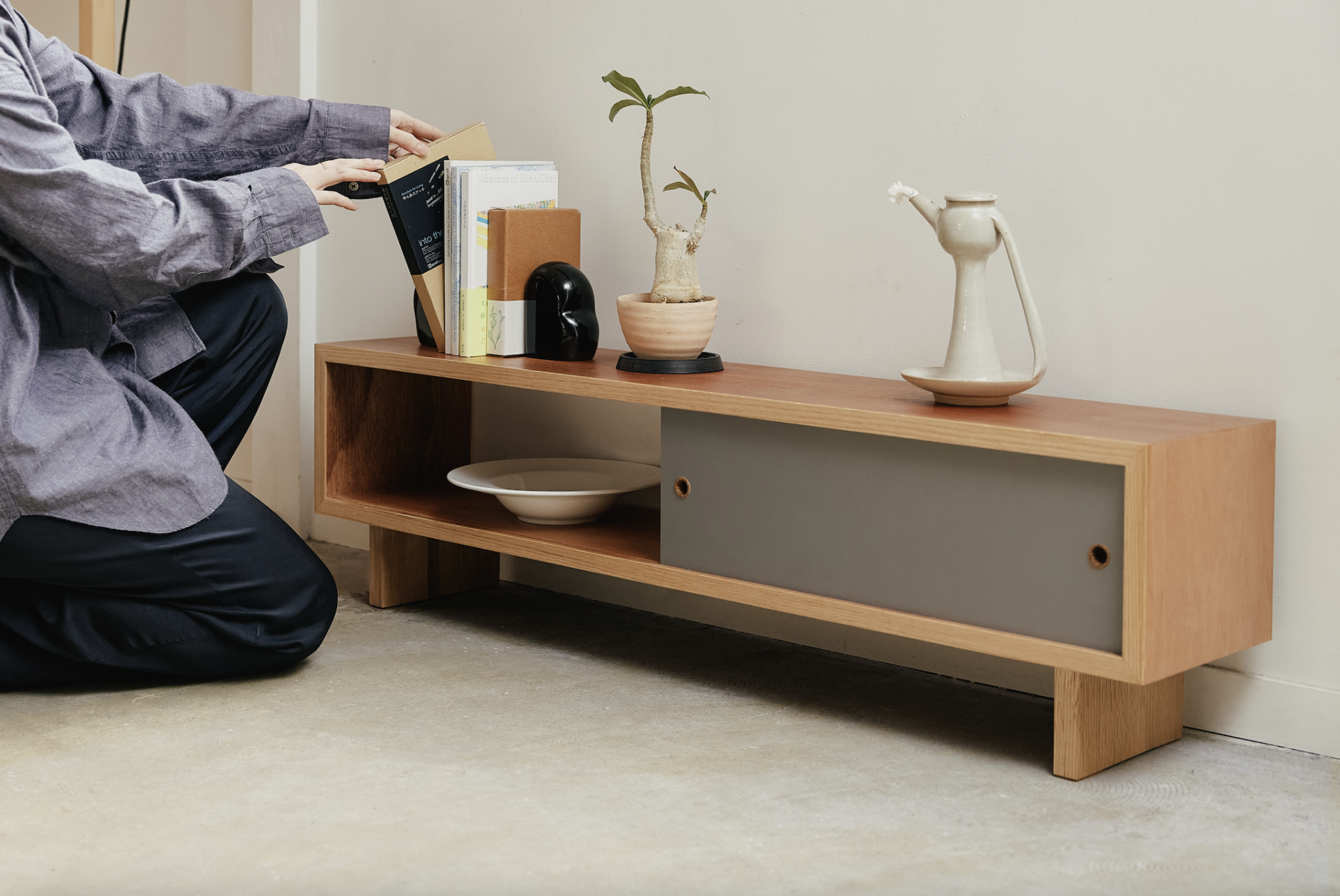 背の低い佇まいは空間に圧迫感を与えず、お気に入りのオブジェや本を置いて楽しめるのも魅力です。重量は約4.5kgと軽く、女性ひとりでも持ち運びができるため、暮らしに合わせた配置替えも気軽に行えます。