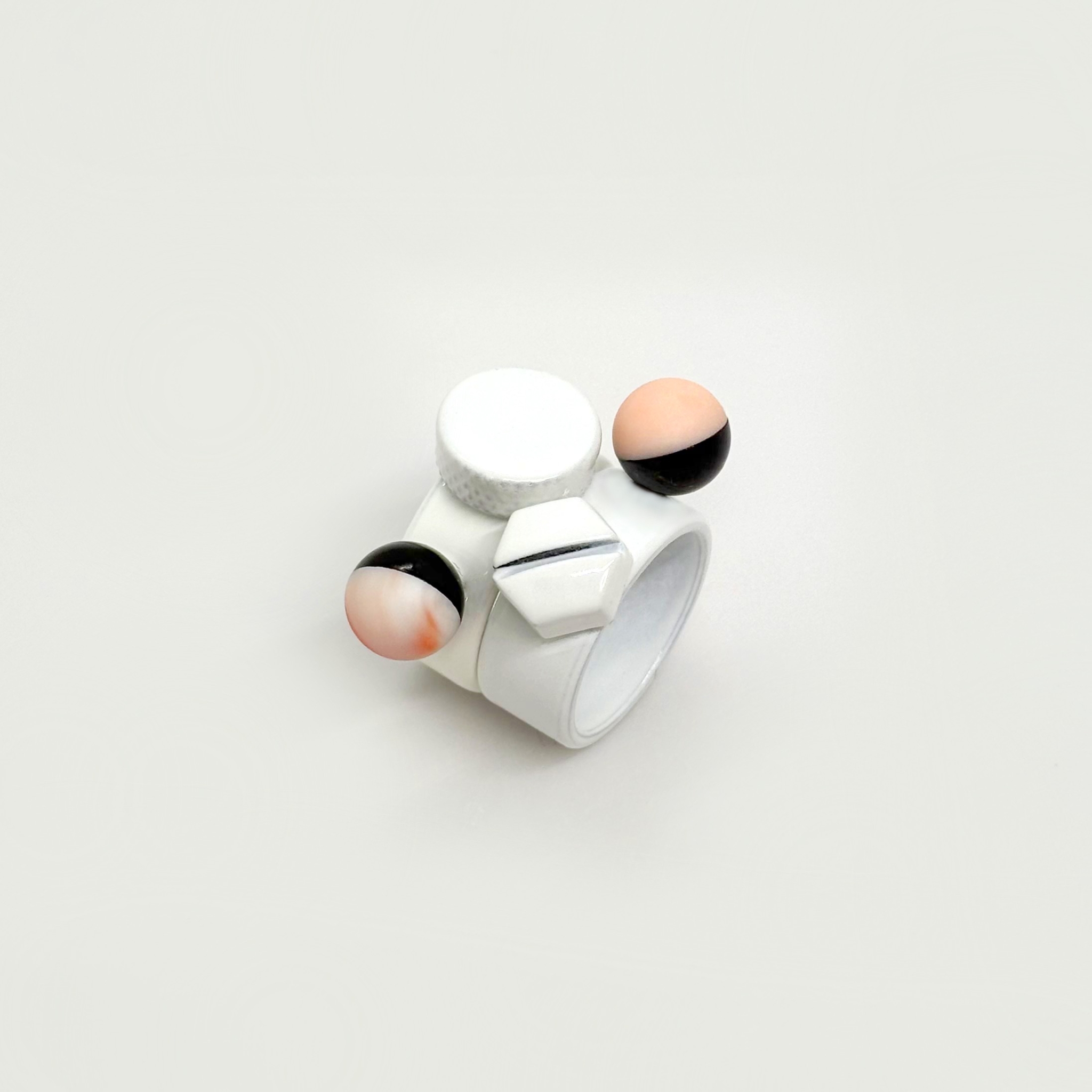 今年の新作としてまずご紹介するのは、淡いピンクと白がにじむように混ざり合う、珊瑚のヘッドパーツ。柔らかく揺らぐ色の層が角度によって表情を変え、深い黒のリングベースに宿るその佇まいは、海の記憶を思わせる静かな気配をまといます。