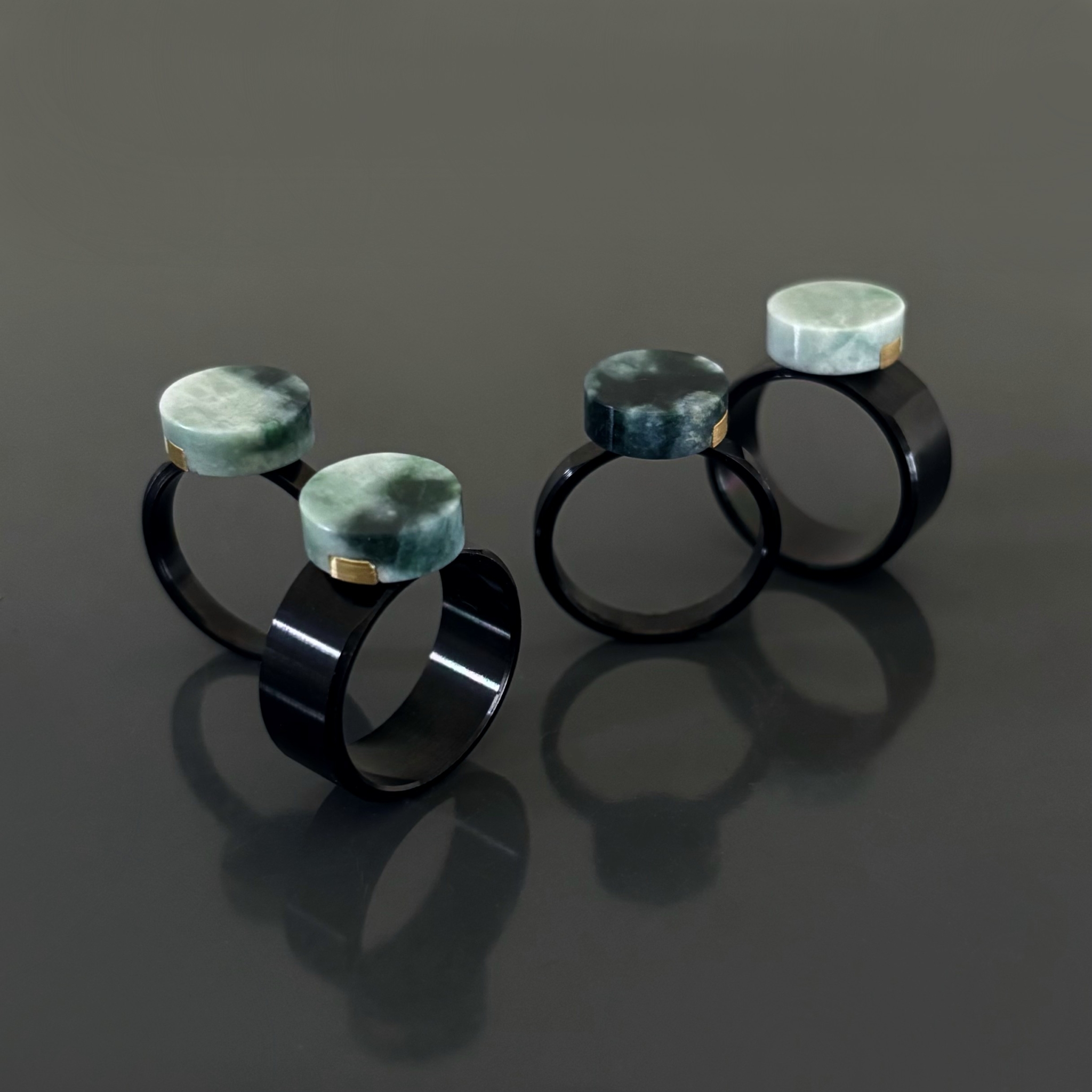 苔のように広がる緑の模様がガラスの中に留まったような独特の透明感はそのままに、球体ならではの立体的な輝きが、Small Factory Ringの世界に新たな表情を添えます。