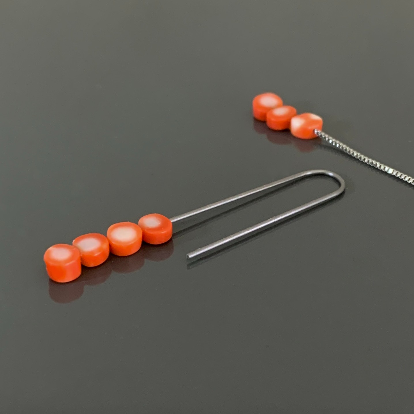 かつてネックレスや羽織留めとして使われていた古い珊瑚をほどき、洗浄し、磨き直し、新たなかたちへと再構成したもの。