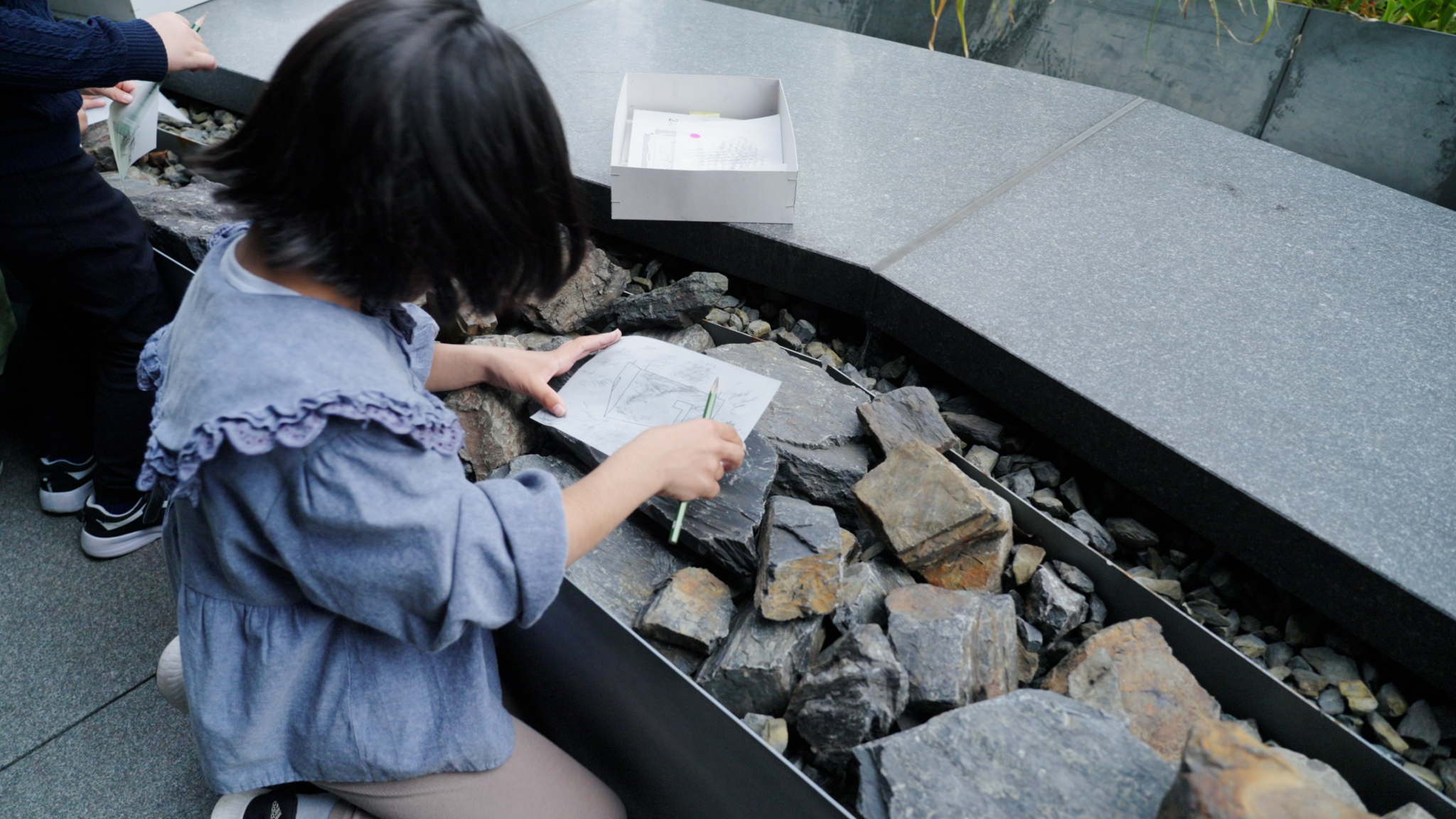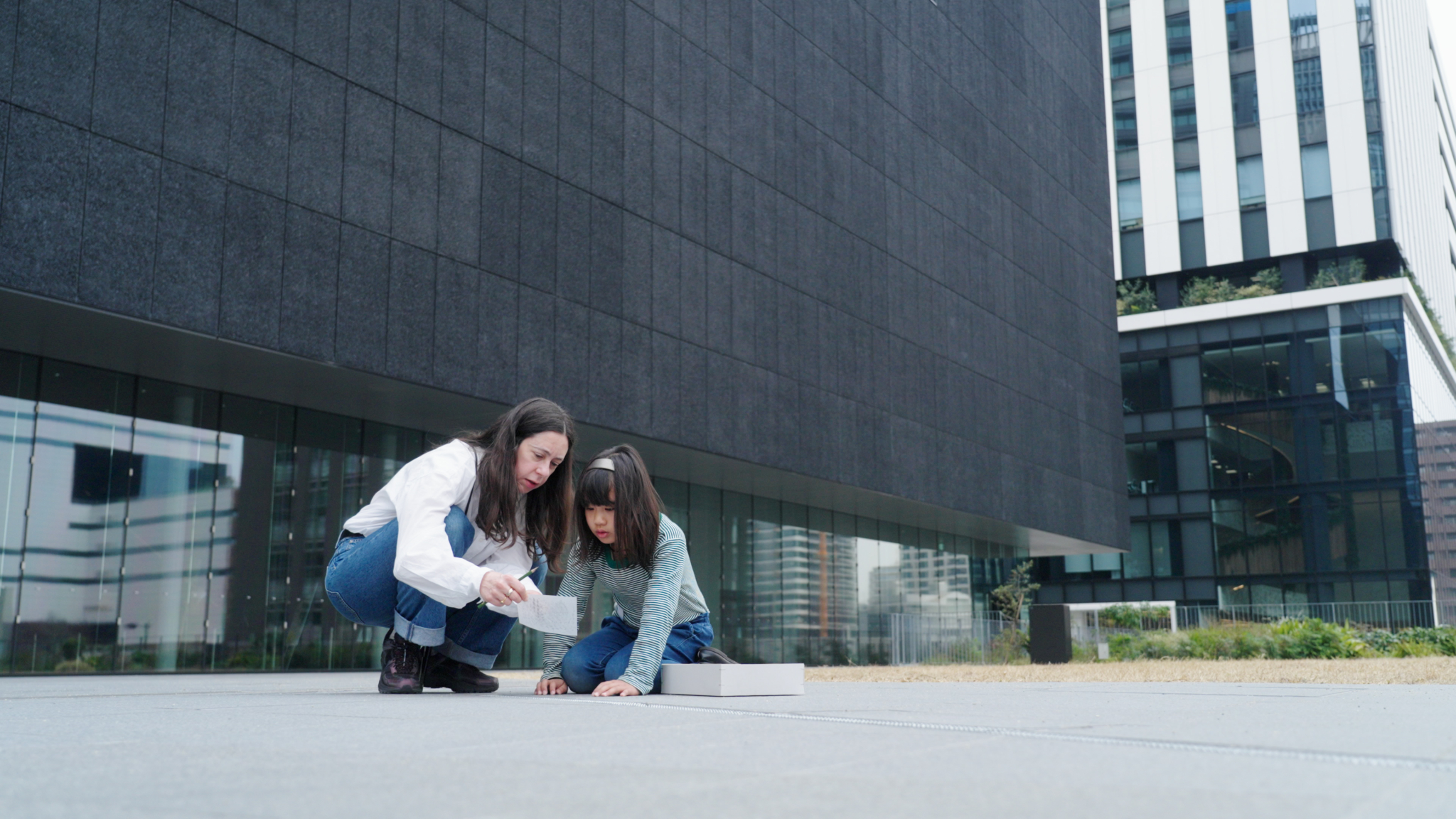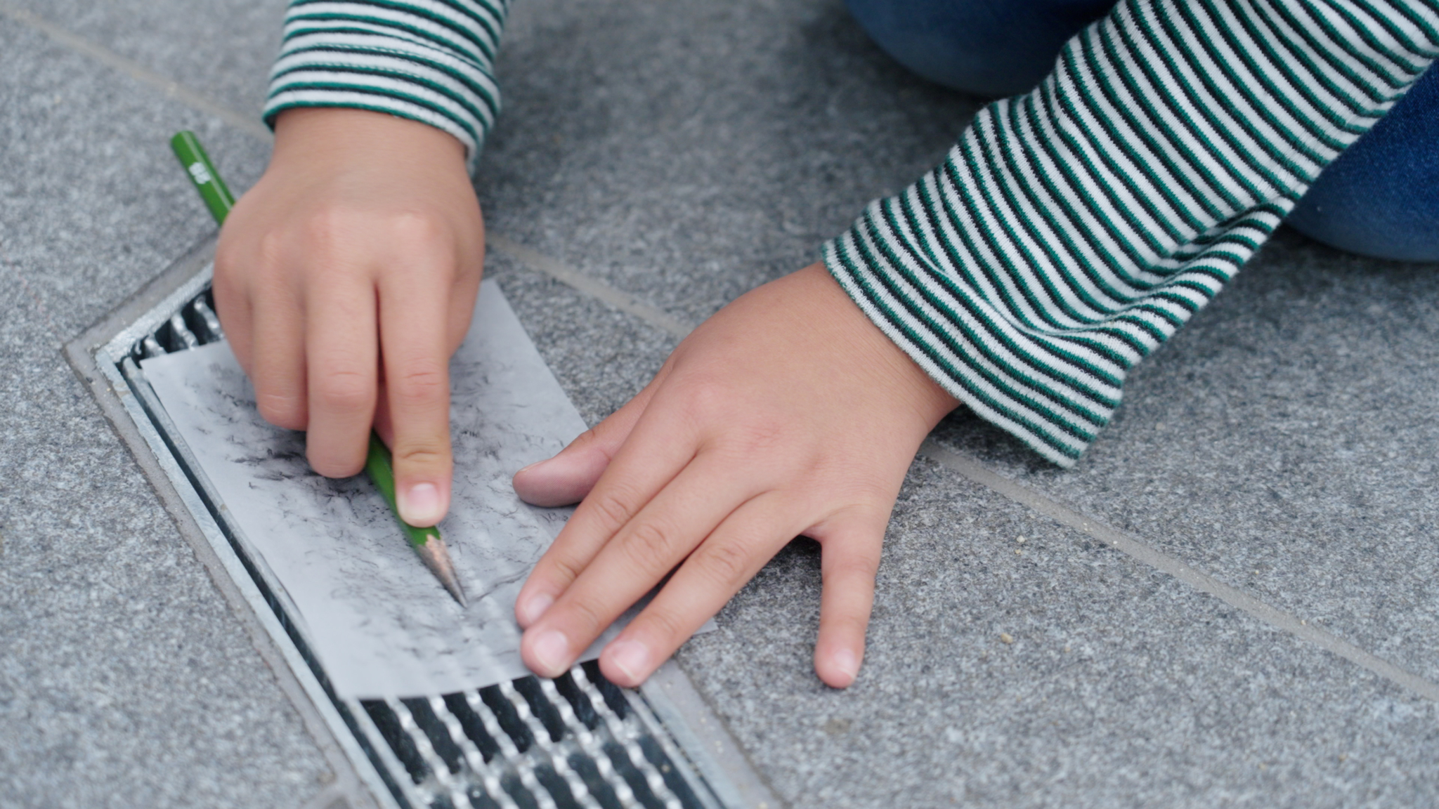 参加したこどもたちは、自分が心惹かれた場所や、床・壁・柱など館内に散りばめられたさまざまなテクスチャーに目を向け、トレーシングペーパーを使って質感やかたちを写し取っていきました。