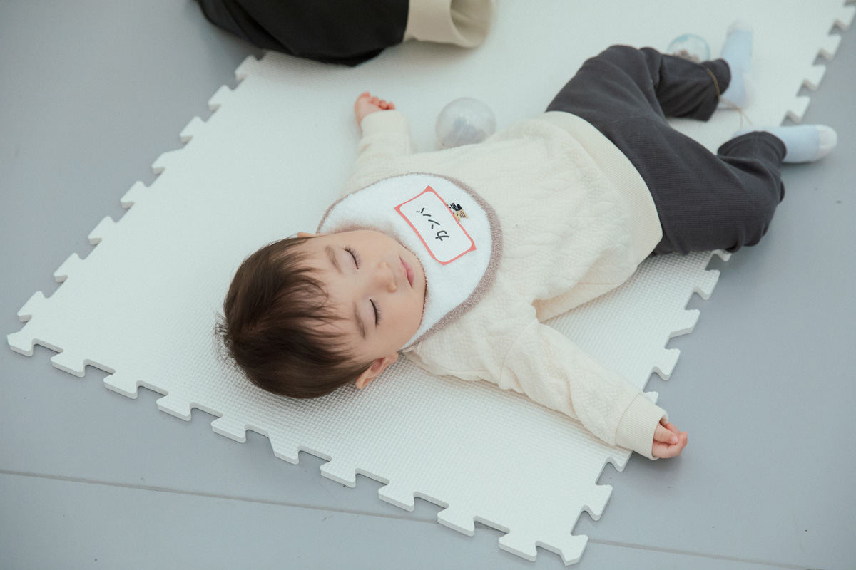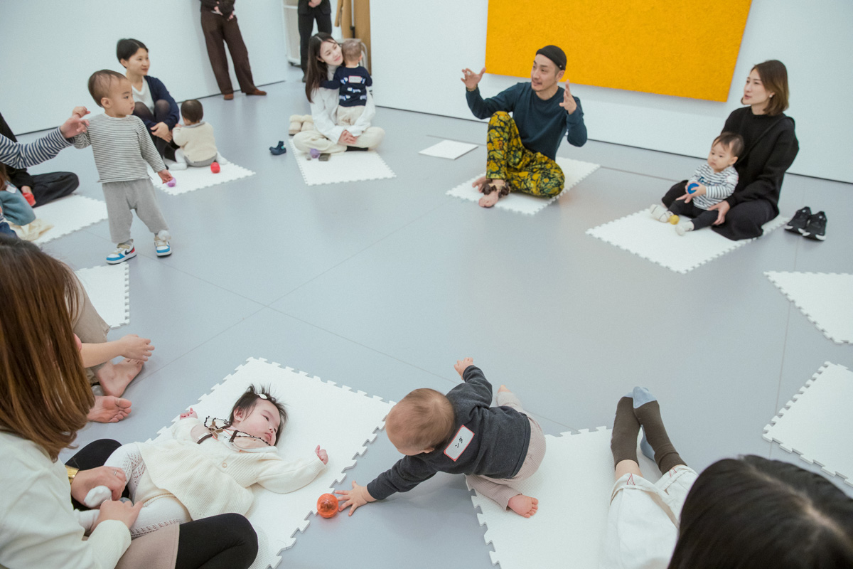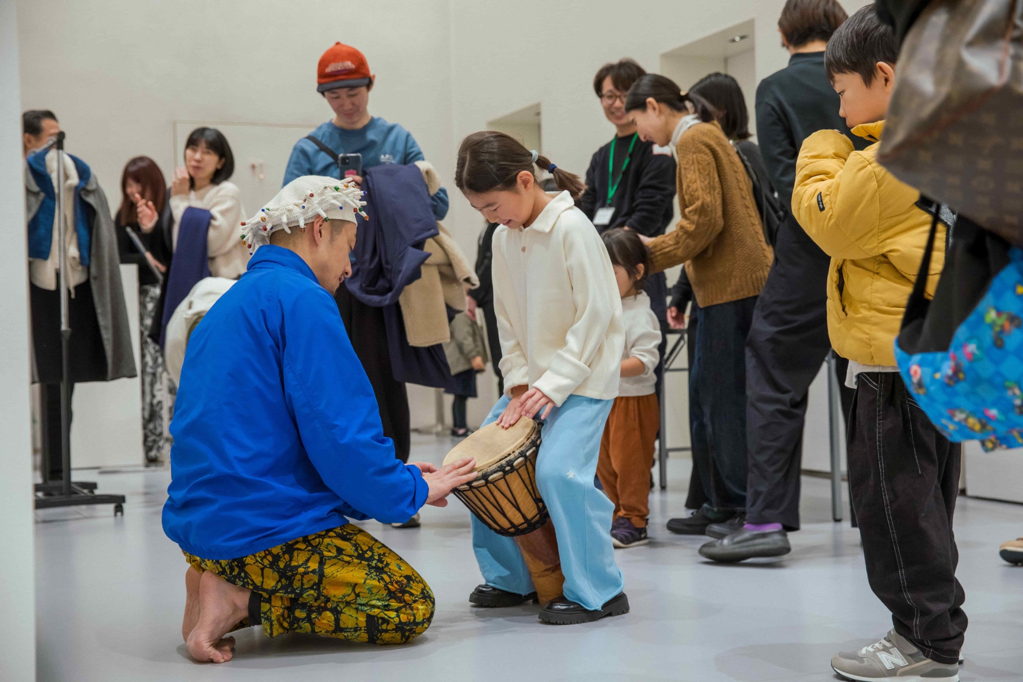 1日目のセッションでは赤ちゃんを対象に、音の鳴るパーカッションを脚につけながら、手拍子、足踏み、声を重ねる音遊びを展開。音の揺らぎやリズムに身をゆだね、それぞれのペースで無限の世界と向き合いました。2日目は、たんぽぽの家、ビッグ・アイとの共同企画として、障がいのある人もない人も一緒に楽しめるプログラムを実施しました。あいさつから始まった音のやりとりは、重なり合うリズムや太鼓の音、さらに森の民Bakaの音が加わることで、会場全体に一体感を生み出していきます。